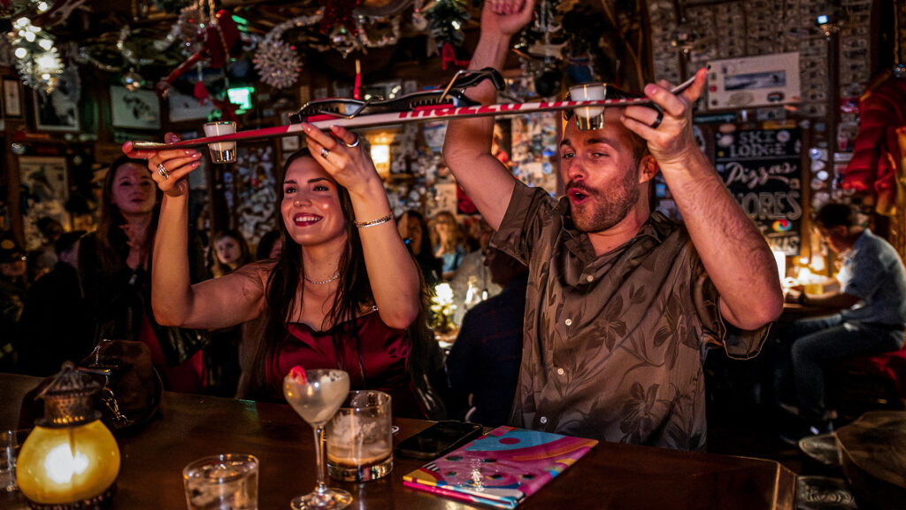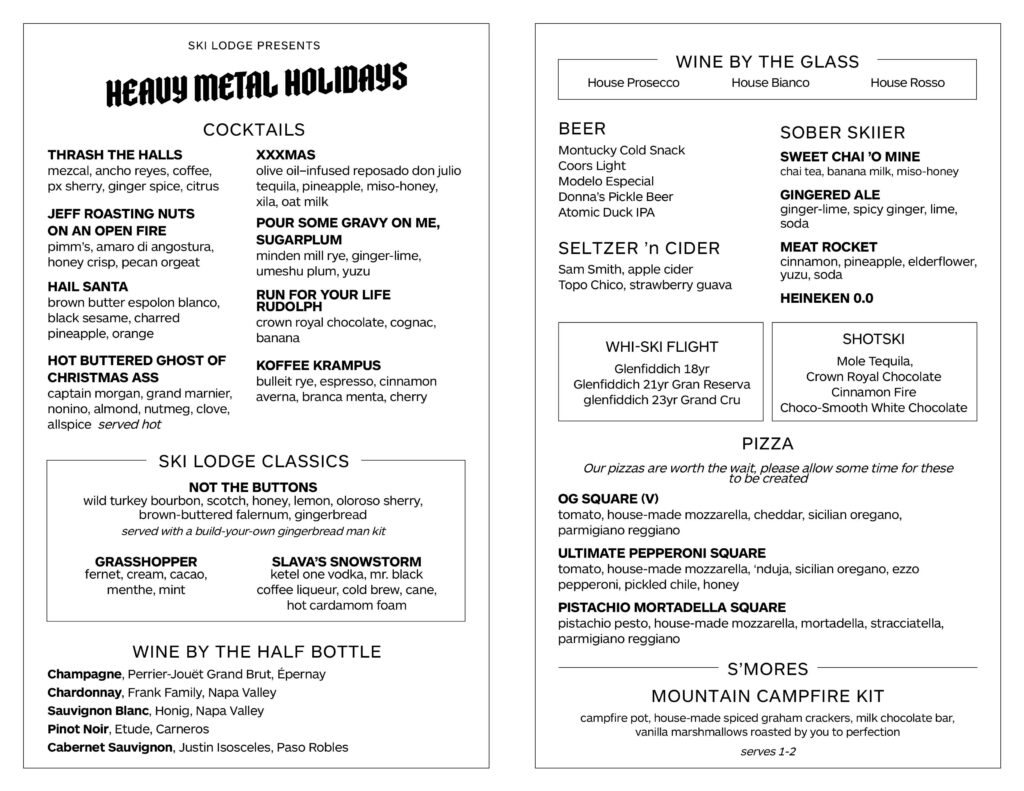 Ski Lodge Heavy Metal Holidays started as a tongue-in-cheek rebellion against the endlessly sweet and predictable December playbook. Underneath all the hardcore and theatrics, though, lives a real soft heart, and that’s the punchline. The polar hardcore vibe, with Bad Santa, leather jackets, loud music, and even louder (and offensive) cocktail names, is all just an armor that it wears in public, whereas inside, the experience is warm, sweet, and deeply generous, just how the holidays should be. My favorite cocktail changes day-to-day, but if I were there right now, I would order a Koffee Krampus, a richly spiced, slightly wicked winter pick-me-up that basically karate-kicks an Espresso Martini straight into a mosh pit.