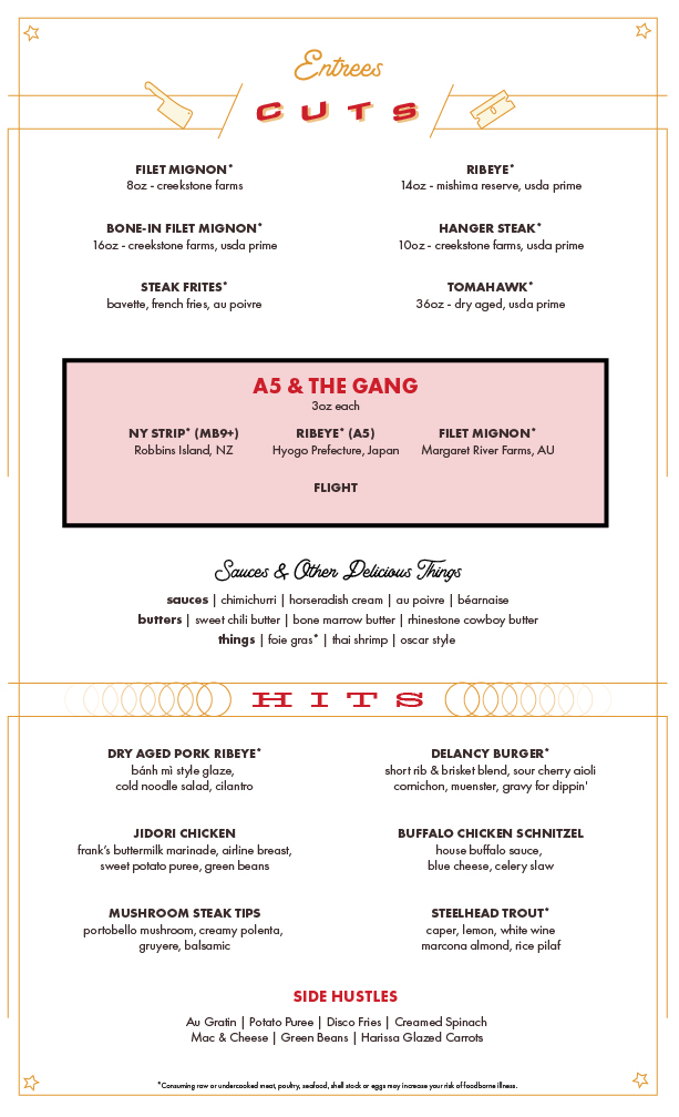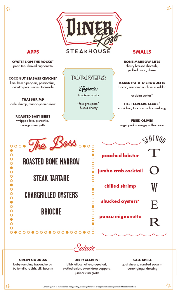 Diner Ross Steakhouse is a rare find, well done – prime steaks, fresh seafood, surprising salads, disco fries, and an award-winning burger, paired with the most deliciously unexpected cocktails in town. Every bite, a banger. Every sip, a celebration. Every seat, a memory. Get down, drink up, steak out.